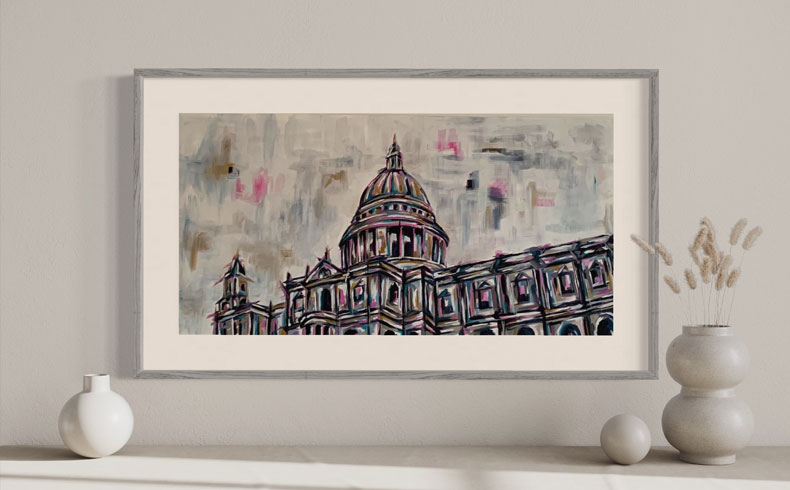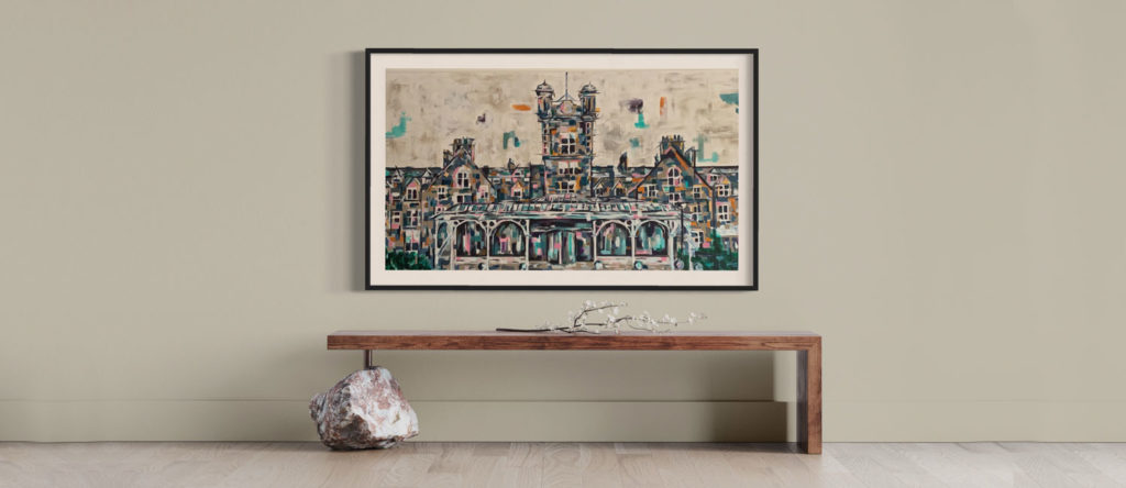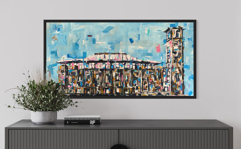 Occasionally I work on larger architectural pieces. Using bold, high contrast colour palettes, layers of expressive marks become a recognisable but abstract interpretation of the building, inviting the viewer to experience details in unusual ways.